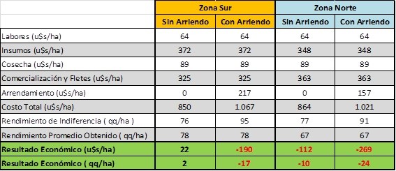 En la tabla se evidencia que, a pesar de los buenos rindes logrados en esta campaña, tan solo alcanzó un mínimo resultado positivo (2 qq/ha) aquel que se ubicó en el sector sur y no tuvo gastos de arrendamiento.
