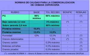 El estándar de calidad de la cebada cervecera es el siguiente, ver Tabla 2.