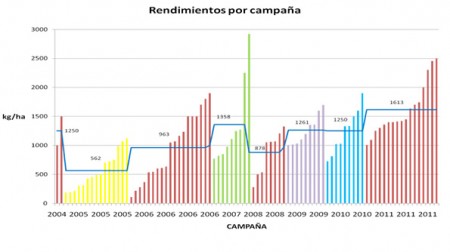 Los rindes se han ido incrementando campaña tras campaña, éstos datos pertenecen al sureste de Entre Ríos (Departamentos: Gualeguychú, Uruguay y Gualeguay).