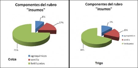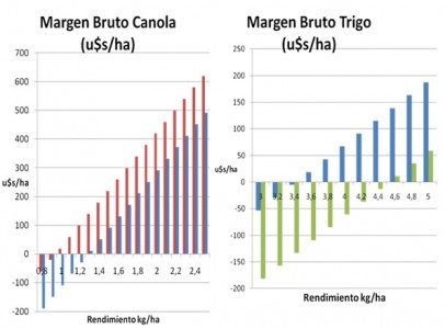 De acuerdo a las gráficas de margen bruto (barras rojas: colza y barras azules: trigo) se deduce que un productor en campo propio requiere alcanzar para el cultivo de colza un rendimiento mínimo de 950 kg/ha (para cubrir sus gastos y obtener ganancia). En cambio con el trigo debería obtener rendimientos mayores a 3.500 Kg/ha.