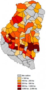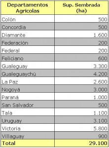 En relación al área sembrada se destacan los distritos Pehuajó al Norte (Dpto. Gualeguaychú); Potrero (Dpto. Uruguay); Algarrobitos (Dpto. Nogoyá); Jacinta y Costa del Nogoyá (Dpto. Gualeguay) y Corrales (Dpto. Victoria) con una superficie que se ubica entre 1.000 ha y 2.000 ha. Estos distritos totalizan 8.800 ha, es decir el 30% del área total.