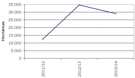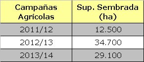 El área sembrada en la campaña 2013/14 totaliza 29.100 ha, detectándose una reducción del 16%, lo cual representa una disminución en el área de 5.600 ha.