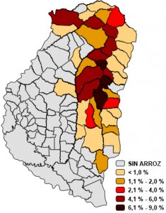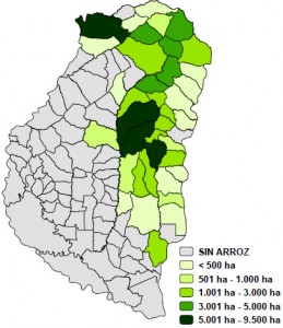 Los distritos que cuentan con mayor superficie dedicada a la producción arrocera son: Distrito 3ero (Dpto. Colón), Tacuaras (Dpto. La Paz), Lucas Sur y Bergara (Dpto. Villaguay); los cuales engloban un área de 29.300 ha, cifra que representa aproximadamente el 40% del total implantado.