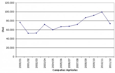 Desde la campaña 2000/01 se presentaron algunos altibajos hasta la 2004/05, momento a partir del cual se evidenció un crecimiento constante llegando a un máximo de casi 100.000 ha; esta disminución del área arrocera prácticamente iguala a lo acontecido hace 4 años.