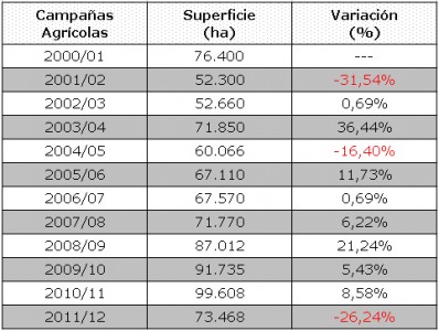 La superficie cultivada con arroz en la presente campaña totalizó 73.468 ha, verificándose una caída del 26,24% con respecto al ciclo 2010/11, lo cual implicó una disminución de 26.140 ha.