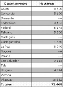 Los departamentos con mayor tradición en la producción de arroz (Colón, San Salvador y Villaguay) abarcaron 34.297 ha, lo cual expresado en porcentaje es el 46,7%.