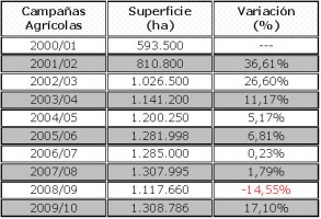 Analizando lo acontecido en los últimos diez años se detecta un significativo crecimiento desde las campañas 2000/01 hasta la 2005/06, momento en el cual la tasa de crecimiento en el área comienza a contar valores menores.
