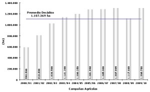 La presente campaña se ubica 201.417 ha por encima del promedio de los últimos diez años, siendo levemente superior al hectareaje correspondiente al ciclo agrícola 2007/08.