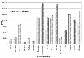 La Paz, Paraná y Villaguay fueron los departamentos que experimentaron los máximos incrementos en el área con respecto a la campaña 2008/09; no obstante cabe recordar que estos departamentos se ubicaron dentro de los más afectados por la sequía del año pasado, hecho que les impidió la siembra de numerosas hectáreas.