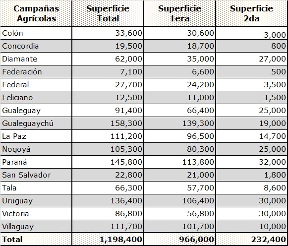 La máxima superficie se detecta en el distrito Pehuajó al Norte (Dpto. Gualeguaychú) con un rango superior a 50.000 ha e inferior a 55.000 ha.