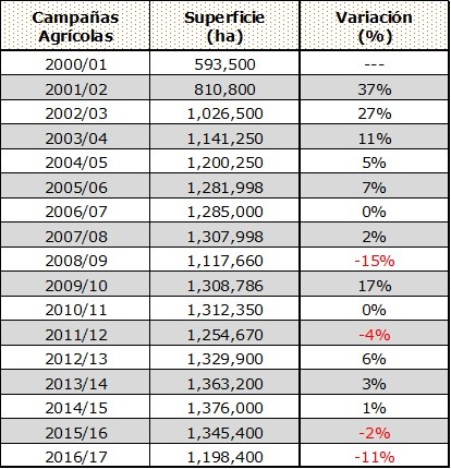 La Tabla Nº 1 presenta la evolución del área destinada a la oleaginosa en la provincia desde la campaña 2000/01.