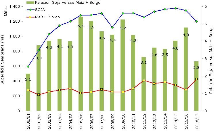 Actualmente esta relación se ubicada en 2,8 (la segunda más baja en los últimos 17 años), es decir que por cada hectárea sembrada con maíz o sorgo existen 2,8 hectáreas de soja. De mantenerse este cociente indicaría que cada tres años como máximo se produciría el cambio de soja por maíz o sorgo.