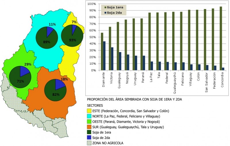 En el Mapa Nº 1 se puede apreciar la proporción entre el área de soja de primera y segunda en los cuatro sectores en los que se ha dividido a la provincia.