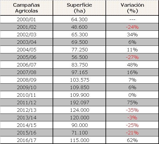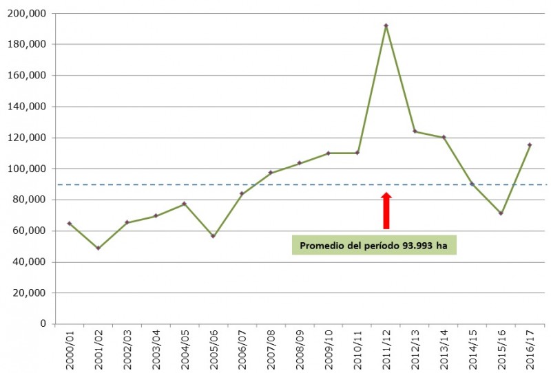 El área cultivada en el ciclo 2016/17 se posiciona en el cuarto nivel de importancia de los últimos 17 años y supera en 21.007 ha al promedio del período que es de 93.993 ha.