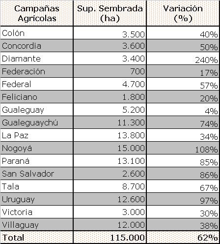 En todos los departamentos se aprecia un crecimiento del área, pero se destaca Nogoyá con una expansión de 7.800 ha que equivalen a una variación interanual del 108%.