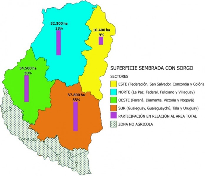 Cabe destacar que del total implantado, el sorgo tipo granífero abarca el 86% (99.000 ha) y el 14% (16.000 ha) restante a materiales forrajeros o sileros.
