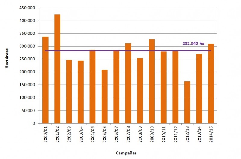 La superficie implantada alcanzó las 309.700 ha verificándose un incremento del 14,3 % con respecto al ciclo 2013/14.