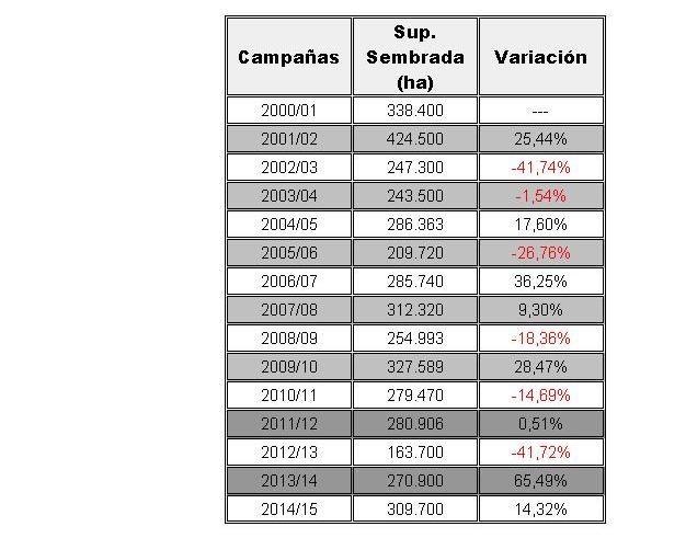 Al analizar la evolución del área sembrada se detectan dos puntos extremos, por un lado un máximo en la campaña 2001/02 donde la superficie alcanzó la cifra de 424.500 ha y un mínimo de 163.700 ha en el ciclo 2012/13, resultado una brecha entre ambos puntos de 260.800 ha. Ver Gráfico Nº 1
