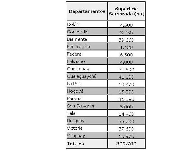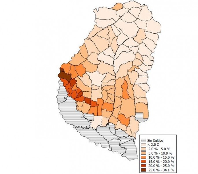 La mayor participación del cereal se detectó en los distritos Palmar y Salto (Dpto. Diamante), con un rango de ocupación que oscila entre 25 % al 34,1 %.
