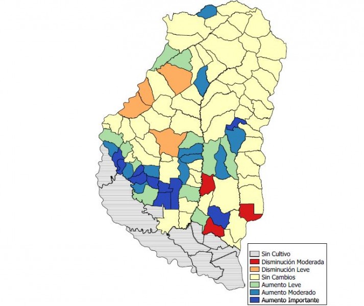 Los máximos incrementos se visualizaron en los distritos: Doll (Dpto. Diamante); Rincón del Doll, Quebrachitos, Corrales, Montoya (Dpto. Victoria); 5º Sauce, 6º Costa de Nogoyá, 4º Clé (Dpto. Gualeguay); Pehuajó al sur (Dpto. Gualeguaychú); Las Colonias (Dpto. San Salvador). El aumento en la ocupación en dichos distritos fué mayor al 4 %.