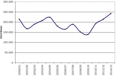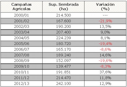 La Tabla 1 se puede apreciar las variaciones interanuales en la siembra del cereal desde la campaña 2000/01 hasta la 2012/13.